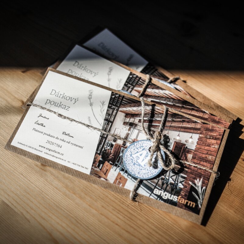 Víceúčelový poukaz Angusfarm je ideálním dárkem pro vaše blízké. Navolte jeho libovolnou hodnotu od 500 Kč do 10 000 Kč.